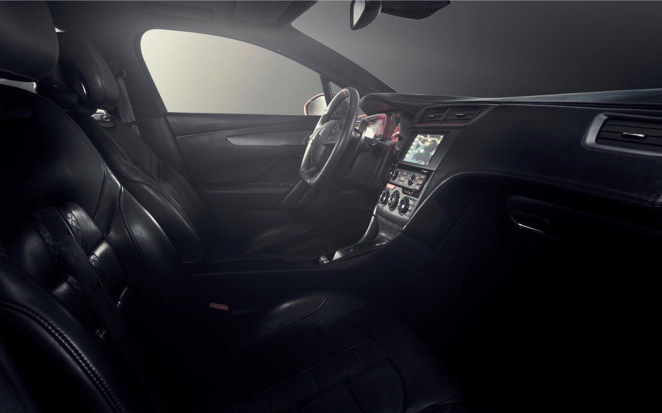 Dentro el lujo es lo que domina, con una variedad de materiales importante. La cabina está cubierta de piel de Alcantara, incluido el salpicadero y el volante. La insignia DS está presente con un bordado especial en los asientos. Todo está cosido en rojo oscuro como el color exterior y la “R” está presente de forma destacada.