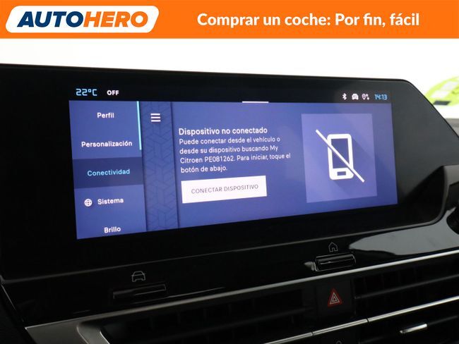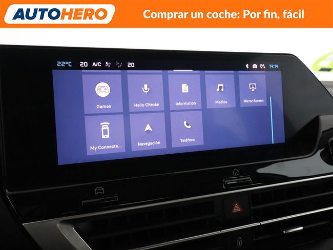 AUTOHERO, Comprar un coche: Por Fin, Fácil Disfruta de nuestras ofertas y ventajas por ser nuestro cliente: - Recoge el coche de tus sueños gratis en cualquiera de nuestros puntos de entrega. ¡solo por tiempo limitado, no lo dejes escapar! - Cuida del coche con el mantenimiento más completo desde 5€ al mes - Financia con nosotros, y consigue uno de los TIN más bajos del mercado - Garantía gratuita de 12 meses incluida y ampliable hasta 36 meses - Política de devolución de 21 días con garantía de devolución del 100% del dinero Este vehículo está disponible en uno de nuestros Autohero Center, llámanos y pregunta su disponibilidad. Nuestro nuevo horario es: L-V: 09:00-21:00, S:10-19 y D:10-14 Pero si no puedes venir, no te preocupes, también puedes comprar el coche de tus sueños en tan solo unos pocos clics. Entra en nuestra web y disfruta de la experiencia Autohero. Características del vehículo: - Sistema de Navegación GPS - Digital cockpit - Faro ECO LED - Control de crucero - Limitador de velocidad - Cámara trasera - Sensores de aparcamiento traseros - Parabrisas calefactable - Asistente a la conducción: Reconocimiento de señales de tráfico - Climatizador automático - Asiento trasero plegable 1/3-2/3 - Levas de cambio en el volante - Volante multifuncional - Columna de dirección (Volante) Mec. regulable altura y longitud - Freno de estacionamiento electr. - Asistente a la conducción: Asistente de subidas - Selector modo de conducción - Elevalunas eléctric. delante - Elevalunas eléctric. detrás - Cierre centralizado - Arranque sin llave - Reposabrazos delantero - Toberas de aire detrás - Bloqueo de elevalunas electricos trasero - Sistema de audio: radio digital DAB con pantalla táctil - USB tipo C - USB - Dispositivo de Bluetooth - Ordenador de a bordo - Entrada 12V - Retrovisores exteriores regulables eléctricamente - Intermitentes en retrovisores - Retrovisores exteriores plegables eléctricamente - Espejo interior - Encendido automático de luces - Limpiaparabrisas con Sensor de lluvia - Luces antiniebla - Parasoles - Luneta trasera calefactable - Programa electrónico de estabilidad (ESP) - Regulación antideslizante (ASR) - Sistema control presión neumáticos - Asistente a la conducción: Sistema asistencia y llamada emergencia (CITROEN Connect) ¿A qué esperas? ¡Tenemos más de 3.000 coches disponibles! Para más información ven a visitarnos a uno de nuestros Autohero Centers o contacta con nuestro equipo por teléfono. KY62997