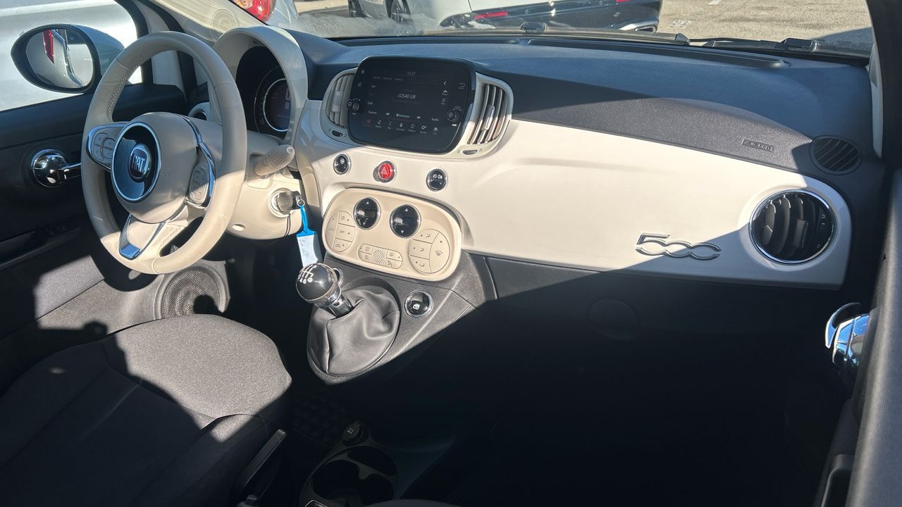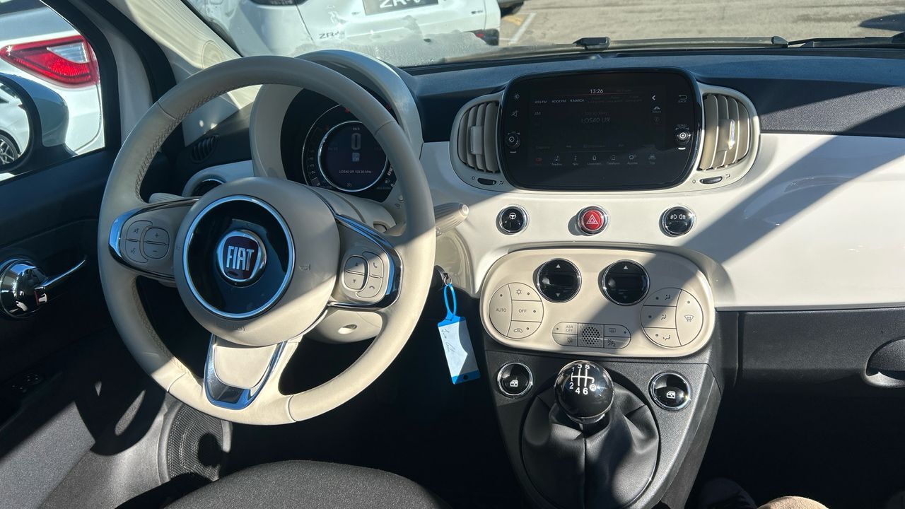 Este Fiat 500 Dolcevita con motor híbrido ligero 1.0 de 70 CV combina estilo urbano y eficiencia. Con 55.875 km, se presenta en color blanco con techo en contraste, lo que refuerza su estética icónica y desenfadada. Su tamaño compacto lo hace especialmente cómodo para moverse por ciudad, con una conducción ágil y consumo contenido. Incluye equipamiento como pantalla táctil con conectividad, aire acondicionado, volante multifunción, asistente de arranque en pendiente y sensores de aparcamiento traseros. El interior mantiene el diseño característico del modelo, con detalles cuidados y buena visibilidad. Es ideal para conductores que valoran el diseño, la practicidad y una movilidad más sostenible en entornos urbanos. Financiación 100% a tu medida y hasta 3 años de garantía. Aceptamos tu coche como parte de pago, con la máxima tasación tanto presencial como online. ***EQUIPAMIENTO SERIE INCLUIDO*** - Cuatro plazas ( 2+2 ) - Seis altavoces - Equipo de audio con radio AM/FM. RDS. radio digital y pantalla táctil pantalla a color y 200 W - Control remoto de audio en el volante - Toma/s de 12v en los asientos delanteros - Dos frenos de disco - ABS - Apertura a distancia del maletero con control remoto - Control de crucero - Iluminación de acceso - Espejo de cortesía en conductor en acompañante - Sensores de aparcamiento traseros con sensor - Combustible: sin plomo 95 octanos y Combustible primario: gasolina - Acabados de lujo: pomo de la palanca de cambios en negro piano y tablero en color brillante - Faros con lente elipsoidal. bombilla halógena y luz larga con bombilla halógena - Regulación de los faros con ajuste de altura manual y sensor de oscuridad - Luces antiniebla delanteras - Encendido diurno automático - Airbag lateral de cortina delantero y trasero - Bandeja trasera rígida - Cierre centralizado con mando a distancia - Airbag frontal del conductor inteligente. airbag frontal del acompañante desconectable y inteligente - Airbags laterales delanteros - Dos reposacabezas en asientos delanteros y asientos traseros ajustables en altura - Cinturón de seguridad delantero en asiento conductor y acompañante con pretensores - Cinturón de seguridad trasero en lado conductor y lado acompañante - Asientos de tela (material principal) y de tela (material secundario) - Asiento delantero del conductor individual. ajuste longitudinal manual y ajuste manual en altura con ajuste manual del respaldo y ajuste manual de la inclinacion de la banqueta. asiento delantero del acompañante individual y ajuste longitudinal manual con ajuste manual del respaldo - Sujetavasos en los asientos delanteros y los asientos traseros - Sistema de ventilación con pantalla digital calefacción del motor - Aire acondicionado de automático - Limpiaparabrisas delantero con sensor de lluvia - Elevalunas eléctricos delanteros con dos de ellos de un solo toque - Navegador con pantalla a color de 7.00 con información en 3D y con voz. control mediante pantalla táctil y información de tráfico 17.8 y 999 - Sistema de servofreno de emergencia - Indicador de baja presion de los neumáticos - Preparación Isofix - Techo de cristal - Sistema activacion por voz - Airbag de rodilla para el conductor - Control de arranque en pendiente - Encendido automático luces emergencia - Bluetooth - Start/Stop parada y arranque automático - Cristal trasero oscurecido en el lateral trasero - Conexión para: USB delantero. 1 y 0 - Limitador de velocidad - Luces de día con tecnología LED - Recuperación de la energía motor - Hibrido suave - Un motor eléctrico de 4.9 CV y 3.6 kW con 50 Nm de par maximo