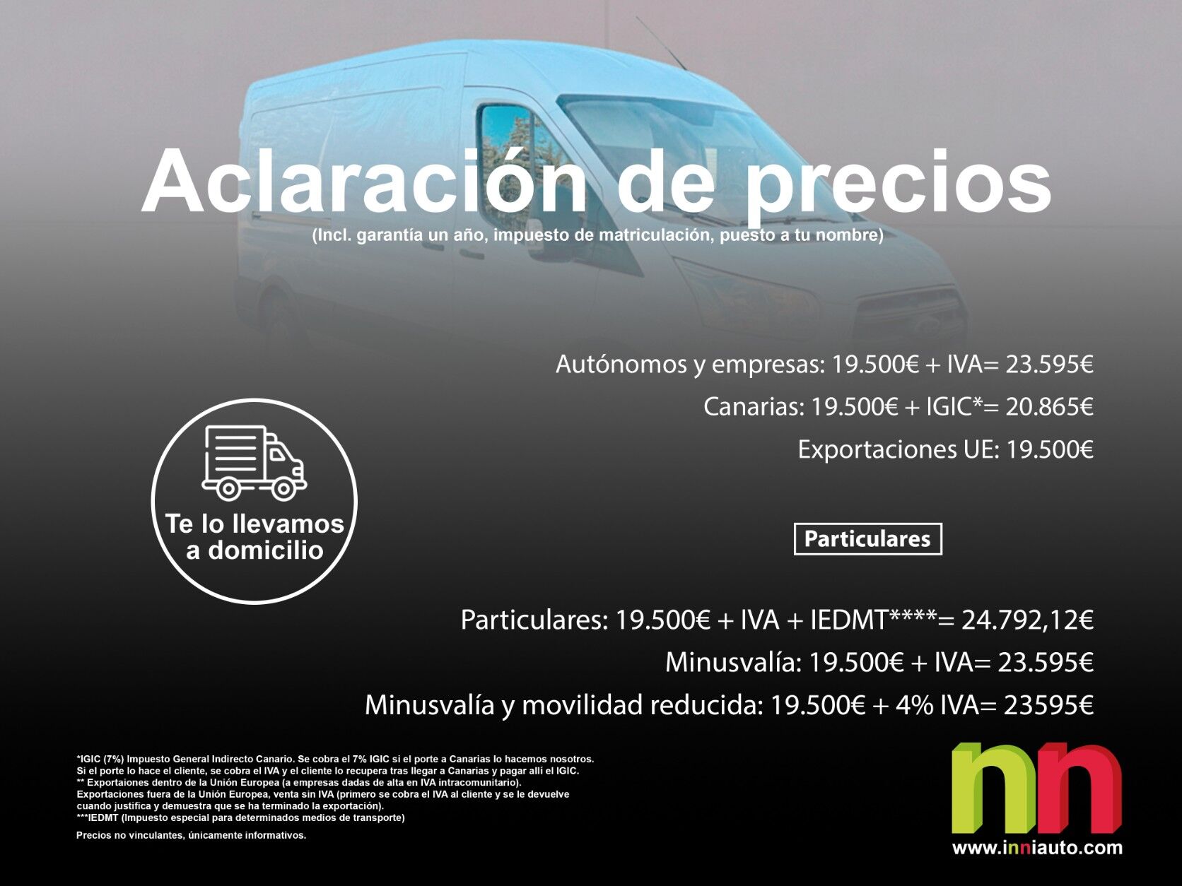 Próximamente preparado FORD Transit L3H2 2.0 EcoBlue 130cv +NAVI de febrero de 2020 Euro6 “Pegatina C” con 97.000kms con nº de chasis WF0EXXTTREKS22266 e IVA deducible Medidas furgoneta: 2530mm de alto, 2059mm de ancho, 5981mm de largo. -Se entregará en perfecto estado de chapa y pintura (pintamos casi todas las furgonetas enteras), zona de carga mejorada, revisado completo de mecánica y con limpieza profesional. – En todas nuestras furgonetas se realiza cambio de aceite con primeras marcas, filtro de aceite, aire, habitáculo y gasoil. En caso de que requiera: Pastillas y discos de freno, neumáticos, embrague, correa de accesorios… y distribución si lo indica el fabricante, si está cerca o si lo consideramos necesario. -Revisiones en la casa, historial de mantenimiento y kilometraje reflejado por escrito. Un solo propietario. Somos especialistas en furgonetas. Estamos en Pamplona (Navarra). PRECIO: Autónomos y empresas: 19.500€ + IVA= 23.595€ Canarias: 19.500€ + IGIC*= 20.865€ Exportaciones UE**: 19.500€ Exportaciones fuera UE***: 19.500€ PARTICULARES: Particulares: 19.500€ + IVA + IEDMT****= 24.792,12€ Minusvalía: 19.500€ + IVA= 23.595€ Minusvalía y movilidad reducida: 19.500€ + 4% IVA= 23595€ *IGIC (7%) Impuesto General Indirecto Canario. Se cobra el 7% IGIC si el porte a Canarias lo hacemos nosotros. Si el porte lo hace el cliente, se cobra el IVA y el cliente lo recupera tras llegar a Canarias y pagar allí el IGIC. **Exportaciones dentro de la Unión Europea (a empresas dadas de alta en IVA intracomunitario). *** Exportaciones fuera de la Unión Europea, venta sin IVA (primero se cobra el IVA al cliente y se le devuelve cuando justifica y demuestra que se ha terminado la exportación). ****IEDMT (impuesto especial para determinados medios de transporte) Accesorios como bacas, bolas de remolque, estanterías, etc… no están incluidos. Consultar disponibilidad –Entregas en toda España. Madrid y Valencia habrá que sumarle 300€ + IVA = 363€. Barcelona 350€ + IVA = 423,5€. Entregas en otras zonas consulta disponibilidad y precio. –Porte a canarias desde 1.110€ + IVA. * Impuestos y gestión no incluidos *El porte se realiza por carretera hasta Huelva y desde allí en ferry hasta la isla correspondiente para los ciudadanos canarios, debiendo el cliente embarcarse también en el ferry para completar el traslado. -Consultar plazo de entrega. -Financiación a tu medida. Consúltanos tu caso. Adaptamos la financiación a tus necesidades. Sujeto a condiciones de cada entidad financiera. Valido salvo error tipográfico. Dispone de aire acondicionado, pantalla multimedia, etc.