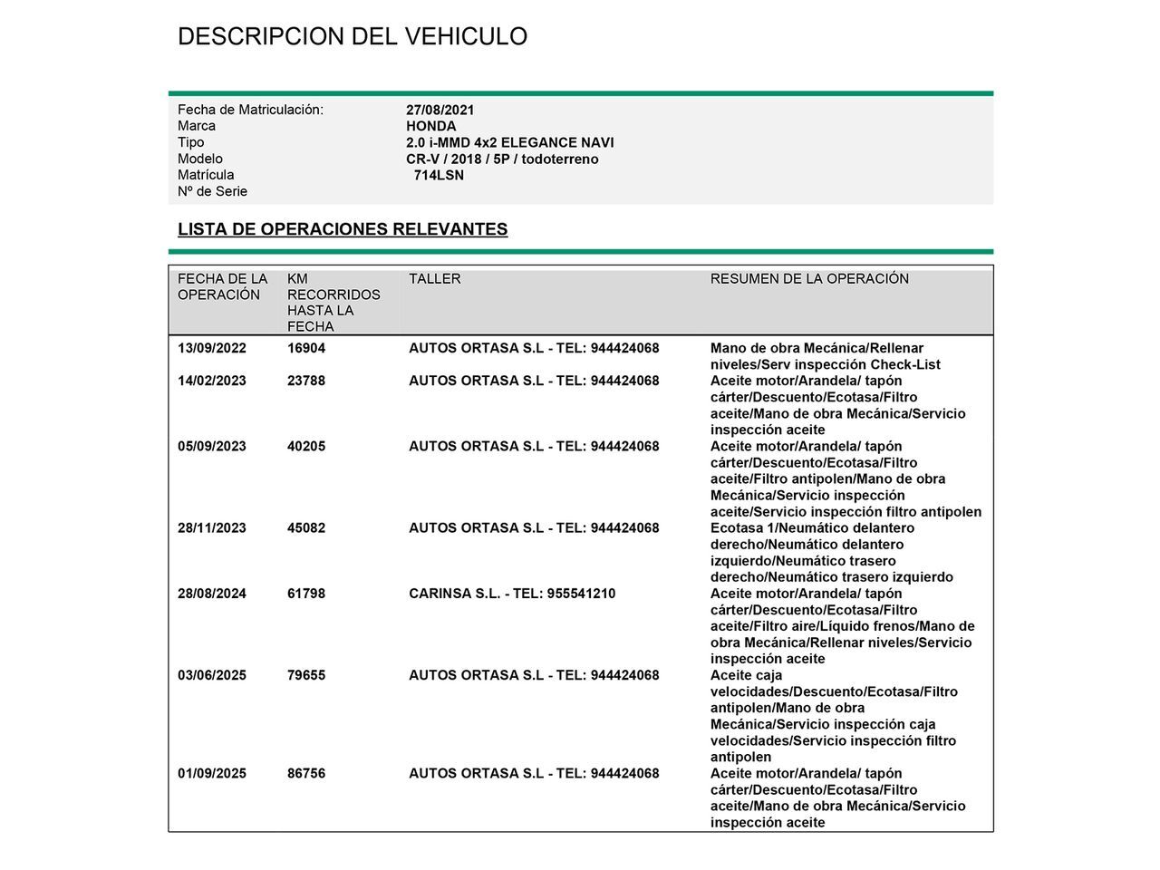 En HRmotor tenemos un coche como nuevo para ti esperándote. Disfrútalo con total tranquilidad, con hasta 2 años de garantía. Contamos con un stock de +3.000 coches de segunda mano para que puedas comprar un coche de ocasión que se adapte a todas tus necesidades y preferencias en nuestros más de 30 concesionarios repartidos en toda España. De esta manera nos encontramos en Madrid con 4 centros; en Barcelona con 4 centros; en Valencia con 3 centros; en Sevilla con 2 centros; en Málaga con 2 centros. Además, nos podrás encontrar también en Lleida, Girona, Castellón, Alicante, Bilbao, Gijón, Mallorca, Murcia, Pamplona, San Sebastián, Tudela, A Coruña, Valladolid, Zaragoza y Elche. Precio al contado de 25990€. o consultar condiciones. Honda CR-V 2.0 i-MMD Elegance * Sujeto a condiciones. Consulte con su comercial V-0329632 ***EQUIPAMIENTO SERIE:*** - Mantenimiento del modelo - Paquete asistente a la conducción (Honda Sensing) - Antena del techo - Retrovisor exterior plegable eléctricamente - Retrovisor exterior regulable eléctricamente y calefactable - Retrovisor exterior con borde acera automát., derecha - Faro Full-LED - Luces antiniebla LED - Encendido automático de luces - Asistente a la conducción: Asistente luz carretera - Función automática de las luces (Coming Home, Leaving Home) - Pilotos traseros LED - Señal freno de mano - Luz de día LED - Lavafaros (Equipo lavafaros) - Limpiaparabrisas con Sensor de lluvia - 9 Altavoces - Dispositivo manos libres con Voice-Control y Bluetooth - Sistema de llamada de socorro - USB-Audio-Interfaz - Conexión-USB detrás (2-posiciones) - Smartphone Interfaz (Apple CarPlay yy Android Auto) - Display multifunción (i-MID) - Indicador de las marchas - Asistente a la conducción: Ayuda aparcamiento delante y detrás - Indicador en pantalla para presión de los neumáticos - Acabado interior: Superficie interior plata - Airbag conductor/acompañante - Sistema de airbag para la cabeza - Airbag lateral delante - Airbag acompañante Desconectable - Reposabrazos central delante - Reposabrazos central detrás - Cubierta del maletero / Persiana - Climatizador automático 2-zonas - Toberas de aire atrás - Calefacción del asiento delante - Asiento delante izquierda regulable en altura - Soporte lumbar Asiento delante izquierda, regulable eléctricamente - Respaldo del asiento trasero dividido/abatible - Reposacabezas detrás (3 posiciones) - Elevalunas eléctric. delante y detrás, con Desmontaje/montaje automát. - Cierre centralizado con Bloqueo confort - Sistema de encendido y apagado Smart-Key - Agarraderos de la puerta ext. color carrocería - Cinturones activos + dinámicos - Iluminación ambiente - Luz de lectura delante - Luces de lectura atrás - Espejo para niños (retrovisor interior extra para zona trasera) - Guantera iluminación - Retrovisor interior con sistema antideslumbramiento autom. - Parasoles con Espejo (iluminación) - Inmovilizador - Sistema de alarma - Portavasos detrás - Portavasos delante - Enchufe (enchufe 12V) en Maletero/compartimento de carga - Enchufe (enchufe 12V) en consola central delante - Enchufe (enchufe 12V) en Salpicadero - Orejas de amarre Maletero/compartimento de carga - Anclajes Isofix para Asiento para niños - Soporte para gafas en Techo interior integrad. - Cámara de marcha atrás con 180° Vista del entorno - Sistema antibloqueo (ABS) - Distribuidor eléctrónico de frenada - Asistente a la conducción: Freno de emergencia - Asistente del freno - Freno de estacionamiento eléctric. - Asistente a la conducción: Freno de emergencia en ciudad (Active City Brake) - Asistente a la conducción: Asistente-evitar un obstáculo y Asistente en curvas - Asistente a la conducción: Aviso de cansancio (Driver-Alert-Control, DAC) - Llantas de aleación 7,5x18 (6 radios) - Volante (cuero) - Columna de dirección (Volante) regulable en altura - Volante con Palancas de cambio - Multifunción para Volante - Programa electrónico de estabilidad (ESP) - Asistente a la conducción: Asistente de subidas (Hill-Holder) - Reducción polución según norma gases escape Euro 6d - Sistema Start/Stop - Filtro partículas-Otto (GPF) (Filtro part. Otto) - Motor eléctrico 135 kW (Propulsión híbrida) - Carrocería: 5 puertas - Tipo transmisión: Tracción delantera - Batalla 2670 mm - Caja de cambios automática continua - ECVT - Híbrido 135 kW (Motor 2,0 Ltr. - 107 kW)