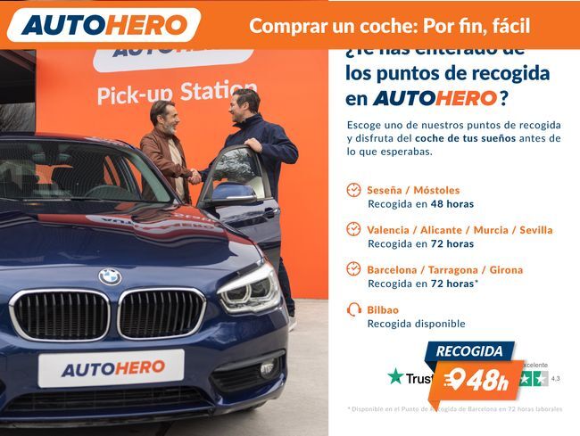 AUTOHERO, Comprar un coche: Por Fin, Fácil Disfruta de nuestras ofertas y ventajas por ser nuestro cliente: - Recoge el coche de tus sueños gratis en cualquiera de nuestros puntos de entrega. ¡solo por tiempo limitado, no lo dejes escapar! - Cuida del coche con el mantenimiento más completo desde 5€ al mes - Financia con nosotros, y consigue uno de los TIN más bajos del mercado - Garantía gratuita de 12 meses incluida y ampliable hasta 36 meses - Política de devolución de 21 días con garantía de devolución del 100% del dinero Este vehículo está disponible en uno de nuestros Autohero Center, llámanos y pregunta su disponibilidad. Nuestro nuevo horario es: L-V: 09:00-21:00, S:10-19 y D:10-14 Pero si no puedes venir, no te preocupes, también puedes comprar el coche de tus sueños en tan solo unos pocos clics. Entra en nuestra web y disfruta de la experiencia Autohero. Características del vehículo: - Sistema de Navegación GPS - Control de crucero (Tempomat) - Cámara trasera - Luna trasera calefactable - Parabrisas calefactable - Asistente a la conducción: Asistente de mantenimiento de carril - Apple CarPlay - Android Auto - Climatizador automático 2 zonas - Asientos traseros abatibles - Bandeja del maletero - Portavasos delante - Reposacabezas detrás regulable - Columna de dirección (Volante) regulable (Vertical / Axial) - Volante con Multifunción - Elevalunas eléctric. detrás - Elevalunas eléctric. delante - Cierre centralizado - Reposabrazos central delante - Bloqueo de elevalunas electricos trasero - Radio - AUX - USB - Bluetooth - Dispositivo de manos libres - Ordenador de a bordo - Indicador de la temperatura exterior - Entrada 12V delante - Intermitente en Retrovisor exterior integrad. - Retrovisor exterior plegable eléctricamente - Retrovisores exteriores regulables eléctricamente - Encendido automático de luces - Luces antiniebla - Luz de lectura - Lunas traseras tintadas - Limpiaparabrisas trasero - Sistema antibloqueo (ABS) - Programa electrónico de estabilidad (ESP) - Sistema control presión neumáticos - Anclajes Isofix para Asiento para niños - Airbag acompañante desconectable - Airbag conductor - Airbag acompañante - Pintura metalizada - Dirección asistida - Sistema Start / Stop - Tracción delantera - Caja de cambios 6-marcha ¿A qué esperas? ¡Tenemos más de 3.000 coches disponibles! Para más información ven a visitarnos a uno de nuestros Autohero Centers o contacta con nuestro equipo por teléfono. DE02407