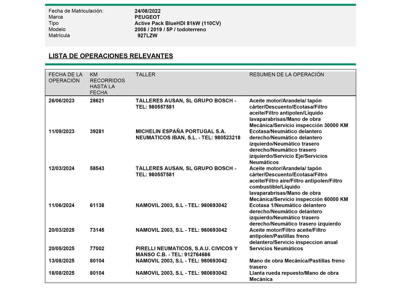 En HRmotor tenemos un coche como nuevo para ti esperándote. Disfrútalo con total tranquilidad, con hasta 2 años de garantía. Contamos con un stock de +3.000 coches de segunda mano para que puedas comprar un coche de ocasión que se adapte a todas tus necesidades y preferencias en nuestros más de 30 concesionarios repartidos en toda España. De esta manera nos encontramos en Madrid con 4 centros; en Barcelona con 4 centros; en Valencia con 3 centros; en Sevilla con 2 centros; en Málaga con 2 centros. Además, nos podrás encontrar también en Lleida, Girona, Castellón, Alicante, Bilbao, Gijón, Mallorca, Murcia, Pamplona, San Sebastián, Tudela, A Coruña, Valladolid, Zaragoza y Elche. Precio al contado de 15020€. o consultar condiciones. Peugeot 2008 1.5 BlueHDi Active Pack * Sujeto a condiciones. Consulte con su comercial V-0318606 ***EQUIPAMIENTO EXTRA:*** - Cámara de marcha atrás con 180° Vista del entorno - Preinstalación para Rueda de reserva/repuesto - Sistema audio-navegador NAC 3-D, DAB+ con pantalla en color y Caja de conexión - Sistema audio-navegador con pantalla en color ***EQUIPAMIENTO SERIE:*** - Retrovisor exterior plegable eléctricamente - Retrovisor exterior regulable eléctricamente y calefactable, ambos - Retrovisor exterior con Tapas coberteras Negro - Barras portaequipajes en el techo - Faro Eco-LED - Regulación del alcance de las luces eléctric. - Intermitente en Retrovisor exterior integrad. - Encendido automático de luces - Función automática de las luces - Pilotos traseros LED - Luz de día LED - Limpiaparabrisas con Sensor de lluvia - Spoiler trasero - Luna trasera calefactable(s) - Sistema de audio RCC (Radio, apto para MP3) - Mandos audio en volante - Servicio móvil Online Mirror Screen - Indicador multifunción con pantalla en color (DGT7C) - Panel de instrumentos digital (virtual cockpit) - Ordenador de a bordo - Indicador de las marchas - Ayuda aparcamiento detrás - Sistema control presión neumáticos - Control de crucero (Tempomat) incl. Sistema limitador de velocidad - Airbag conductor/acompañante - Sistema de airbag para la cabeza detrás - Sistema de airbag para la cabeza (Airbag de la ventana) - Airbag lateral delante - Airbag lateral detrás - Airbag acompañante Desconectable - Reposabrazos central delante - Techo interior Mistral - Climatizador automático (Termotronic) - ? Filtro de polvo y polen - tapicería asientos: Tela - Asiento delante izquierda regulable en altura - Asientos delante regulable en altura - Bolsas portaobjetos en respaldo asientos delant. - Respaldo del asiento trasero dividido/abatible - Reposacabezas detrás (3 posiciones) - Elevalunas eléctric. delante izquierda con Transmisor de impulsos - Cierre centralizado con Mando a distancia - Cierre centralizado incl. Bloqueo de la puerta autom - Dispositivo de alarma para Cinturones de seguridad - pirotécnico Tensor del cinturón - Iluminación ambiente - Portavasos delante - Orejas de amarre Maletero/compartimento de carga - Anclajes Isofix para Asiento para niños en Asiento trasero - Suelo del maletero practicable, Variable - Sistema antibloqueo (ABS) - Distribuidor eléctrónico de frenada (EBD) - Asistente a la conducción: Freno de emergencia - Asistente a la conducción: Active Guard (Asistente del freno) - Freno de estacionamiento eléctric. - Asistente a la conducción: Aviso de colisión frontal con función del freno - Asistente a la conducción: Sistema de aviso de colisión - Asistente a la conducción: Reconocimiento de señales de tráfico - Asistente a la conducción: activo Asistente de mantenimiento de carril - Asistente a la conducción: Asistente para la atención - Llantas de aleación 6,5x16 (10 radios) - Kit reparación de neumáticos (Mobility-Pack) - Volante con Multifunción - Dirección asistida eléctric. - Regulación antideslizante (ASR) - Programa electrónico de estabilidad (ESP) - Asistente a la conducción: Asistente de subidas (HLA) - Reducción polución según norma gases escape Euro 6d - Instalación de arranque y parada (Motor de arranque) - Sistema Start/Stop (Función) - Filtro partículas - Carrocería: 5 puertas - Tipo transmisión: Tracción delantera - Batalla 2605 mm - Caja de cambios 6-marcha - Motor 1,5 Ltr. - 88 kW CDTI DPF