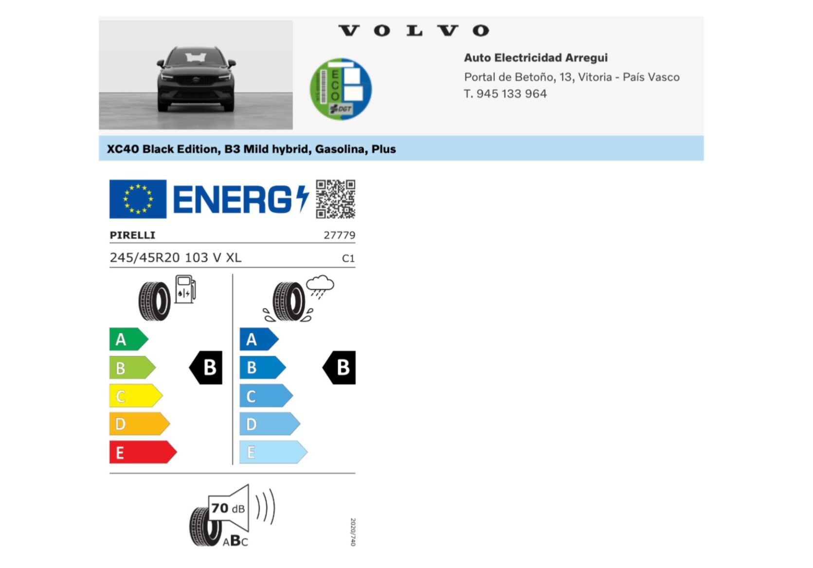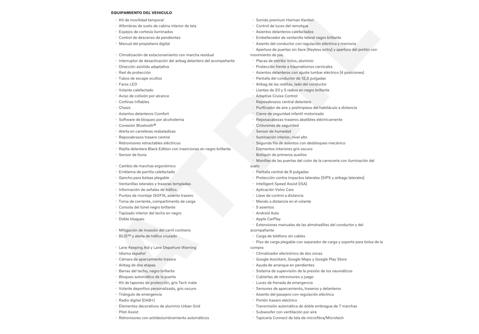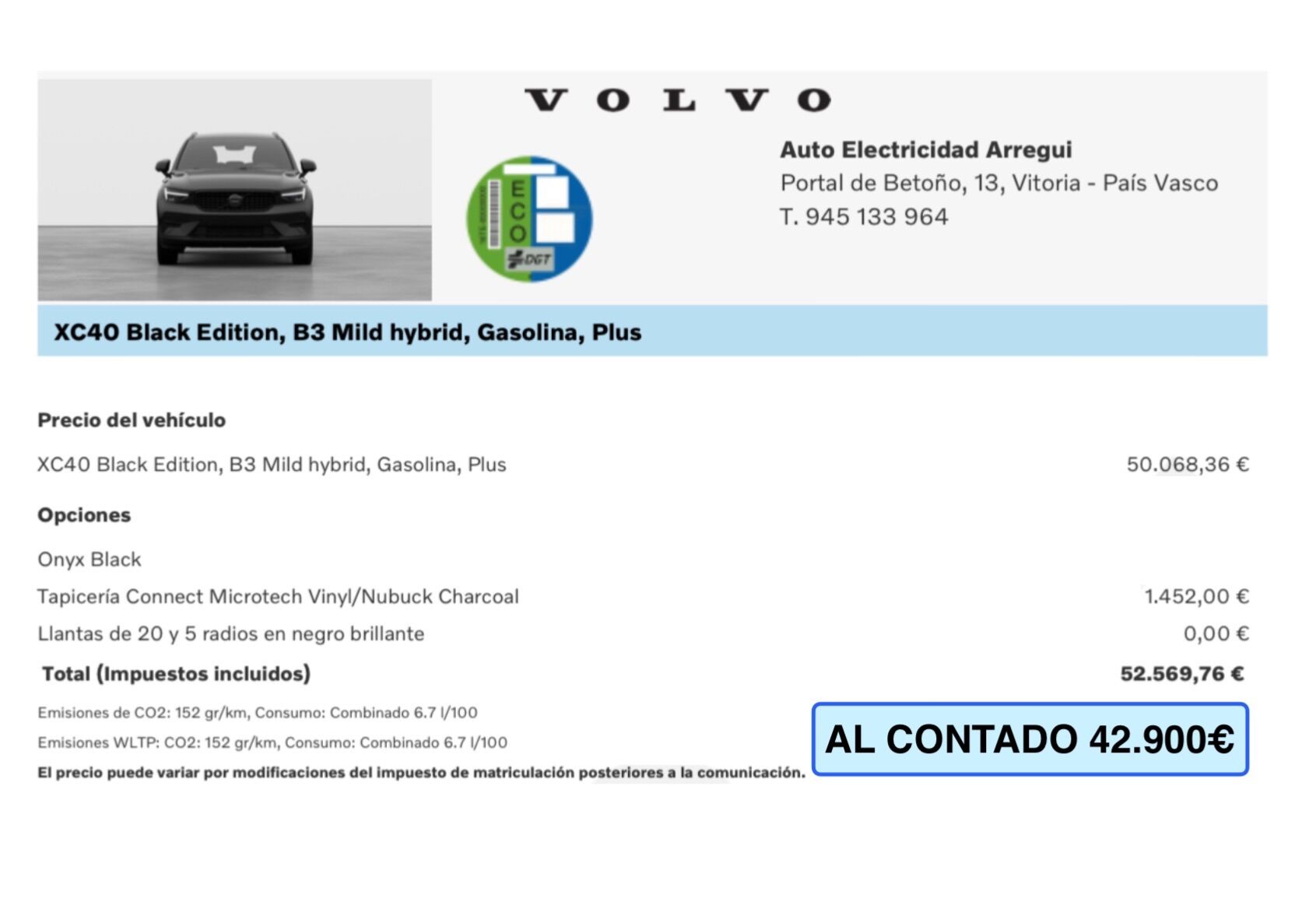 EDICIÓN ESPECIAL BLACK EDITION. ETIQUETA ECO Equipamiento a destacar en esta unidad a estrenar Km0: -Sistema de sonido Alto Rendimiento con sistema Google integrado (Google Assistent), Smartphone Integration y cargador de Smartphones por inducción. -PACK DRIVER ASSIST: IntelliSafe Assist+Surround (Sistema alerta al conductor, advertencia+prevención choque, detector cansancio, sensor somnolencia (driver-alert), reconocimiento de señales, asistente de salida de carril, detector presencial angulo muerto, regulador velocidad adaptativo, PILOT ASSIST) -PACK PARK ASSIST: Cámara trasera Sensores de aparcamiento delanteros+traseros -PACK VERSATILITY PACK Asientos traseros+reposacabezas abatibles Iluminación exterior cortesía entrada y salida del vehículo Espejos retrovisores con sistema anti deslumbramiento KEYLESS (entrada+cierre+arranque de vehículo sin llave) Toma 12V maletero Separador de carga maletero Portón trasero eléctrico -Asientos deportivos con regulacion electrica y memoria con tapicería Connect Microtech Vinyl/Nubuck Charcoal y regulación de altura, apoyo de fuerza lateral y cojines extensibles -Iluminación LED Sistem adaptativo, con intercambiador inteligente de luces carretera largas/cortas automáticas -Espejos retrovisores interior+exteriores con sistema antideslumbramiento -Iluminación interior alto nivel -Pintura metalizada Onyx Black -Llantas de 20" y 5 radios dobles en negro brillante con corte de diamante -Rueda de repuesto provisional AL CONTADO 42.900€ VOLVO OPTION 41.900€ DESCUENTOS ADICIONALES POR FINANCIACIÓN: Consulte a su comercial por el sistema VOLVO OPTION, la mejor alternativa para la compra de su nuevo vehículo. Disponemos también de distintas ofertas en financiación desde un 5,95% y de hasta el 100% del importe del vehículo. Pídanos información y condiciones sin compromiso. Garantía 36 meses. Aceptamos vehículo como parte de pago. Posibilidad de entrega en península. Pídanos presupuesto. COMPROMISO ARREGUI: -Publicaciones reales: fotografías propias de cada vehículo, kms, precio, equipamiento y extras/opciones tal como lo encontrará en nuestras instalaciones. -Posibilidad de devolución en 15 días/1.500kms. Anuncio no vinculante, puede contener errores. Contenido meramente informativo y no contractual. Consultar. VOLVOARREGUI COM, Concesionario Oficial en VOLVO en ALAVA.