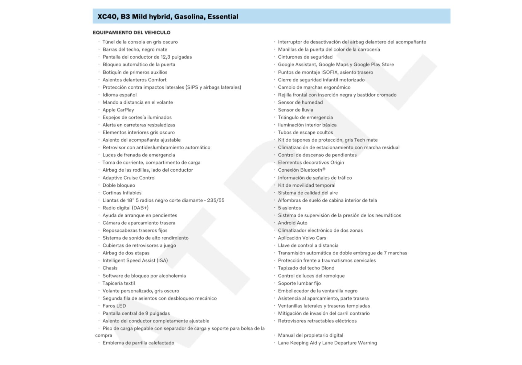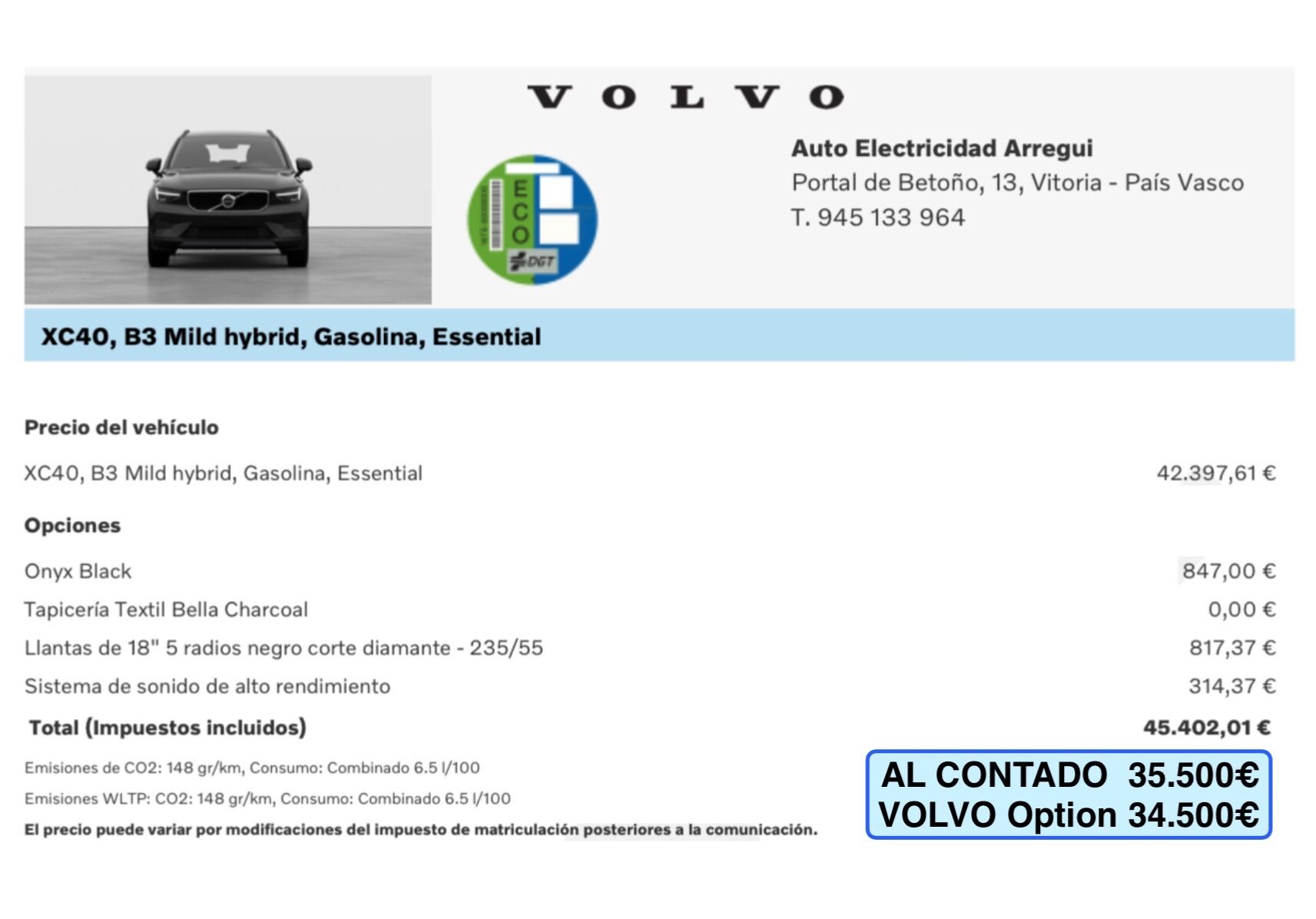 Unidad a estrenar a un precio muy especial por objetivo fin de stock 2025, disponible a la llegada al concesionario. (Disponibles más unidades en stock con diferentes equipamientos hasta alcanzar objetivo. Consulte con su comercial) Equipamiento adicional al de serie: -Pintura metalizada Onyx Black -Tapicería Textil Bella Charcoal -Llantas de 18" 5 radios negro corte diamante - 235/55 -Sistema de sonido de alto rendimiento AL CONTADO 35.500€ Volvo Option 34.500€ DESCUENTOS ADICIONALES POR FINANCIACIÓN: Consulte a su comercial por el sistema VOLVO OPTION, la mejor alternativa para la compra de su nuevo vehículo. Disponemos también de distintas ofertas en financiación desde un 5,95% y de hasta el 100% del importe del vehículo. Pídanos información y condiciones sin compromiso. Garantía 36 meses. Aceptamos vehículo como parte de pago. Posibilidad de entrega en península. Pídanos presupuesto. COMPROMISO ARREGUI: Posibilidad de devolución en 15 días/1.500kms. Anuncio no vinculante, puede contener errores. Contenido meramente informativo y no contractual. Consultar. VOLVOARREGUI COM, Concesionario Oficial en VOLVO en ALAVA.