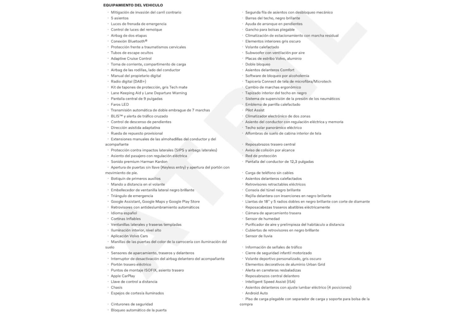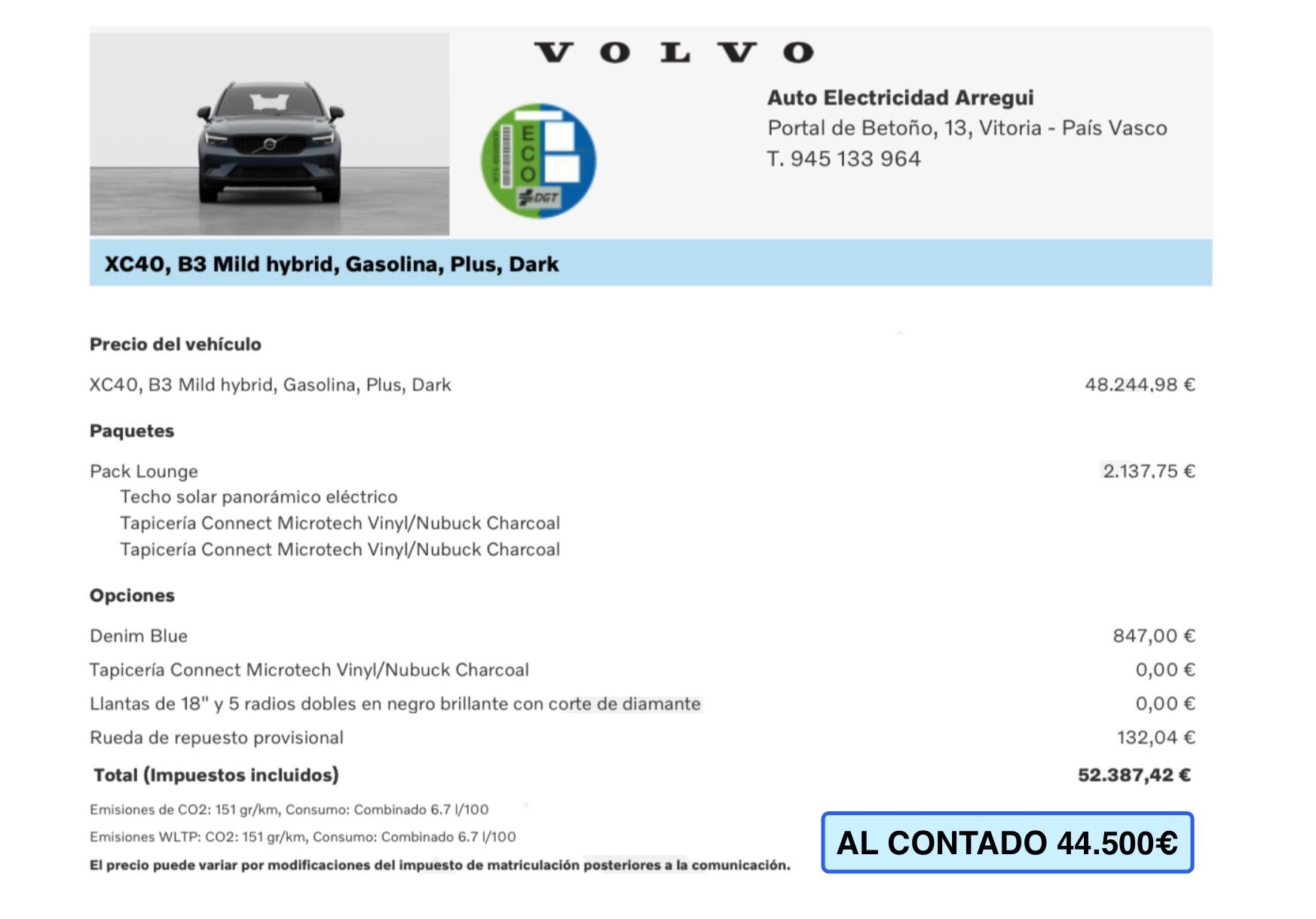 Equipamiento a destacar en esta unidad a estrenar Km0: -Sistema de sonido Alto Rendimiento con sistema Google integrado (Google Assistent), Smartphone Integration y cargador de Smartphones por inducción. -PACK DRIVER ASSIST: IntelliSafe Assist+Surround (Sistema alerta al conductor, advertencia+prevención choque, detector cansancio, sensor somnolencia (driver-alert), reconocimiento de señales, asistente de salida de carril, detector presencial angulo muerto, regulador velocidad adaptativo, PILOT ASSIST) -PACK PARK ASSIST: Cámara trasera Sensores de aparcamiento delanteros+traseros -PACK VERSATILITY PACK Asientos traseros+reposacabezas abatibles Iluminación exterior cortesía entrada y salida del vehículo Espejos retrovisores con sistema anti deslumbramiento KEYLESS (entrada+cierre+arranque de vehículo sin llave) Toma 12V maletero Separador de carga maletero Portón trasero eléctrico -PACK LOUNGE Techo solar panorámico eléctrico Asientos deportivos con regulacion electrica y memoria con tapicería Connect Microtech Vinyl/Nubuck Charcoal y regulación de altura, apoyo de fuerza lateral y cojines extensibles -Iluminación LED Sistem adaptativo, con intercambiador inteligente de luces carretera largas/cortas automáticas -Espejos retrovisores interior+exteriores con sistema antideslumbramiento -Iluminación interior alto nivel -Pintura metalizada Denim Blue -Llantas de 18" y 5 radios dobles en negro brillante con corte de diamante -Rueda de repuesto provisional AL CONTADO 44.500€ VOLVO OPTION 43.500€ DESCUENTOS ADICIONALES POR FINANCIACIÓN: Consulte a su comercial por el sistema VOLVO OPTION, la mejor alternativa para la compra de su nuevo vehículo. Disponemos también de distintas ofertas en financiación desde un 5,95% y de hasta el 100% del importe del vehículo. Pídanos información y condiciones sin compromiso. Garantía 36 meses. Aceptamos vehículo como parte de pago. Posibilidad de entrega en península. Pídanos presupuesto. COMPROMISO ARREGUI: -Publicaciones reales: fotografías propias de cada vehículo, kms, precio, equipamiento y extras/opciones tal como lo encontrará en nuestras instalaciones. -Posibilidad de devolución en 15 días/1.500kms. Anuncio no vinculante, puede contener errores. Contenido meramente informativo y no contractual. Consultar. VOLVOARREGUI COM, Concesionario Oficial en VOLVO en ALAVA.